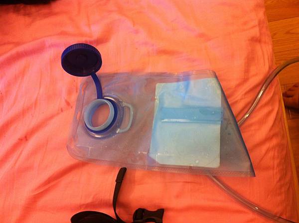 兩公升的水袋,第一次使用前要先沖一下,但是儘管我沖過了,喝起來水還是有塑膠味 (會不會塑化劑中毒啊?)