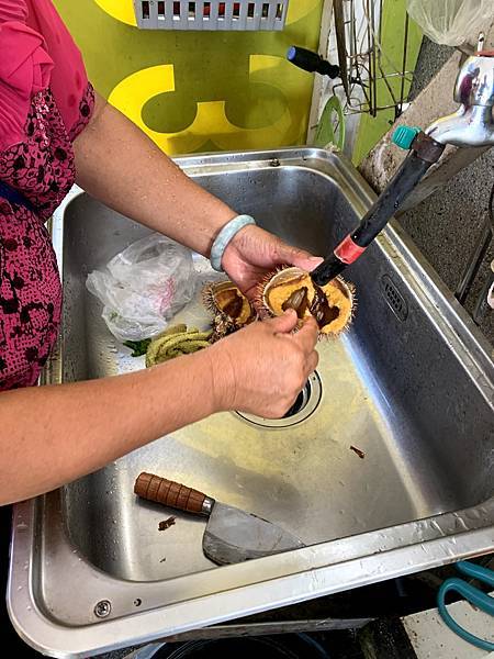 對於海膽怎麼打開一直有疑問,看老闆娘用菜刀剖開才知道。根據我的常識,吃海膽其實是吃海膽的生殖腺,所以我們等同是吃了一堆海膽的精液進去。