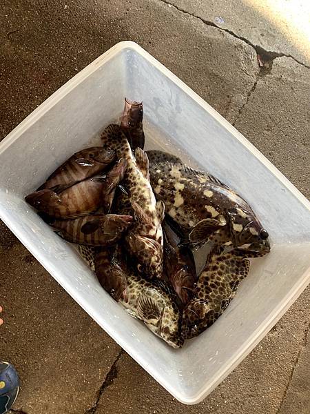 ↓ 在我們慢慢用餐的時候,老闆娘的老公、兒子也都陸續回來,帶著一箱一箱的石斑,身在澎湖真的有「靠海吃海」的感覺。小孩們看得很有興趣