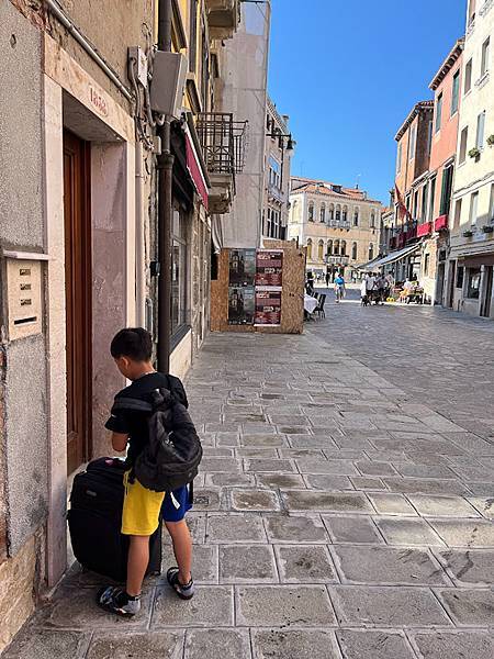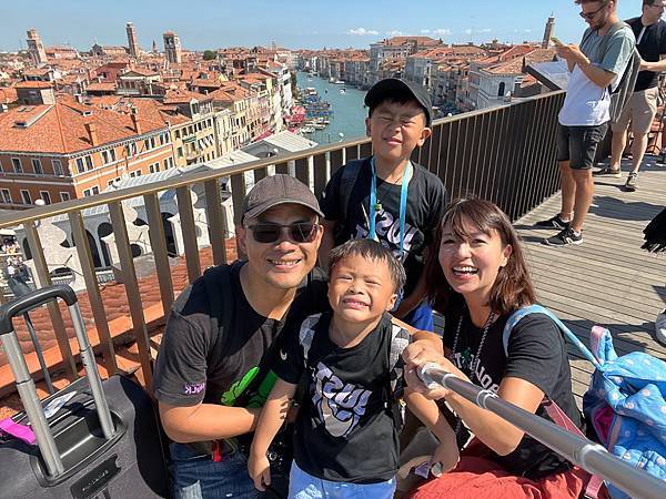 吃完早餐,寫完日記 (是的!就算來威尼斯只帶著登機箱還是把日記給帶著,算是小孩的每天作業),放了兩個大人的城市稅的現金在房內,歸還了鑰匙,然後我們就出門,這樣子也弄到了上午十點半,早上我們預約了十一點十五分在DFS這棟百貨公司可以上天台觀覽Venice河道風光的行程,眼看我們應該會有點趕的過去,根據昨天半夜我們走路的經驗,光是大人一直走也要20分鐘,再拉著小孩可能會更久,所以我們選擇了繼續搭公船過去。