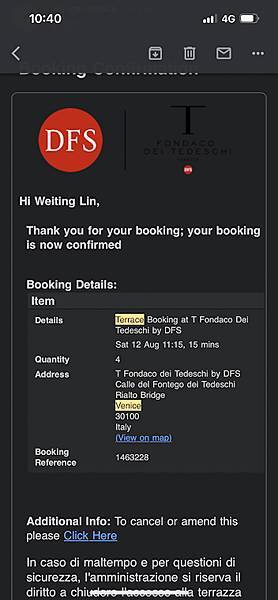 DFS 是一個百貨公司的集體,在Rialto附近有一間為 T Fondaco Dei Tedeschi (翻譯起來是德國人的T倉庫) 的百貨公司,我看他人的網誌都寫的為T百貨,基本上在google map搜尋 DFS就會秀出來這間。而且就真的在Rialto的橋邊。