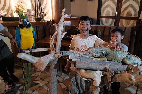 ↓ Lobby有一些動物可以拍照,在看照片的時候才發現亮亮正在模仿鸚鵡的嘴巴超可愛的
