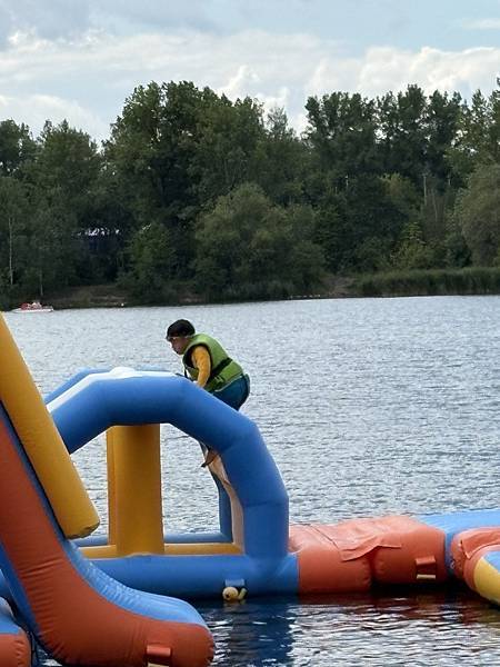 因為在住所附近看到有店家在賣泳圈,我們詢問了房東是否這裡有泳池,透過airbnb的翻譯,房東說這附近的湖邊有泳池。我就在想,是不是我今天在湖邊看到的那個充氣滑水道呢?所以我就跟莎莎說我知道在那裡,但是我個人十分不建議前往,早上起床跑步氣溫只有20度,我想水溫應該也差不多,小孩會冷死吧?但是我們經不住小孩的要求,只好驅車前往。(這湖邊附近竟然有白線不用錢的停車)